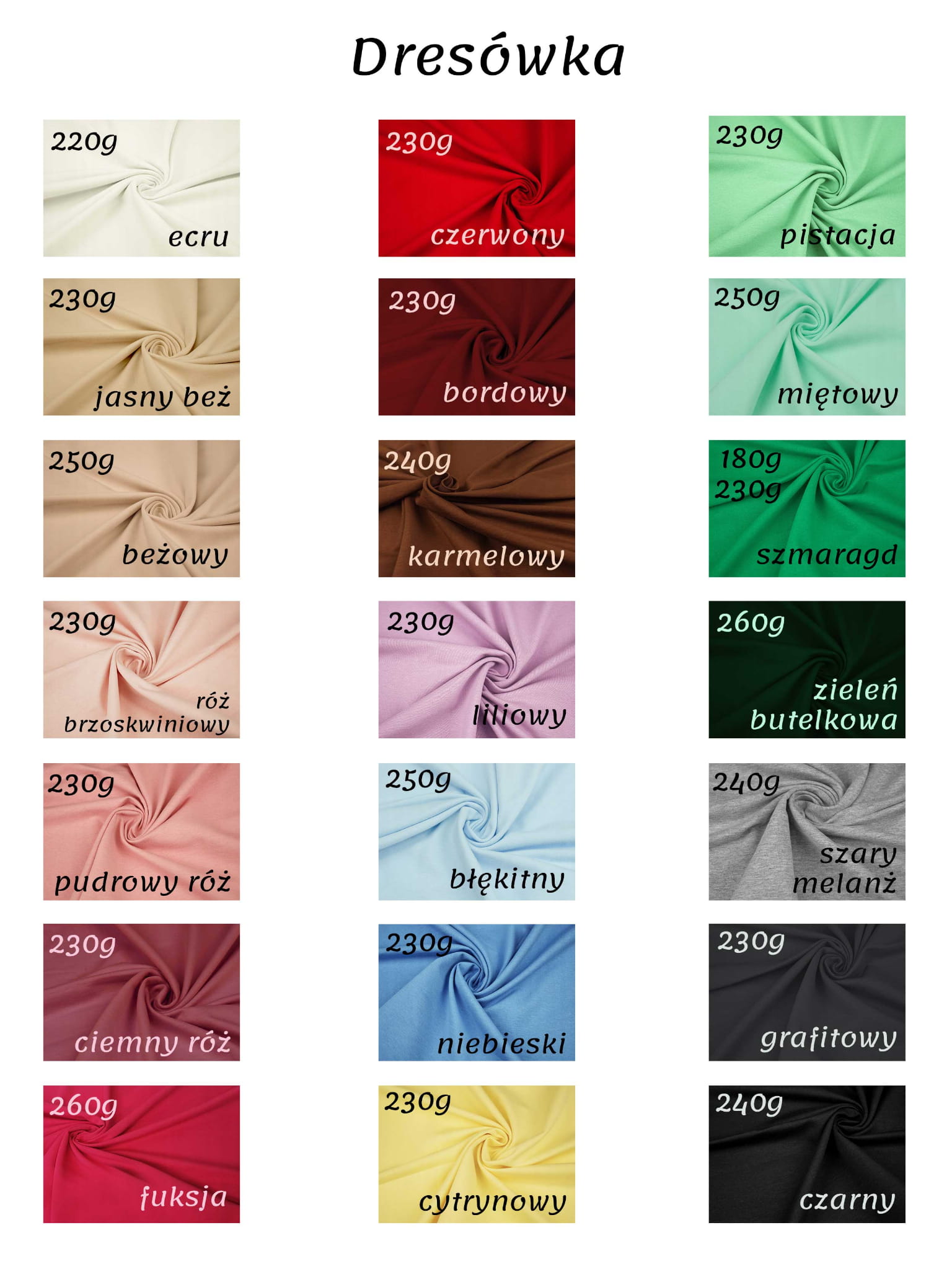 Proponujemy wysokogatunkową dzianinę dresową w bardzo dużej gamie kolorystycznej. Dzianina ta jest miękka, przyjemna w dotyku, elastyczna. Jest stabilna w szyciu i użytkowaniu oraz łatwa w konserwacji.