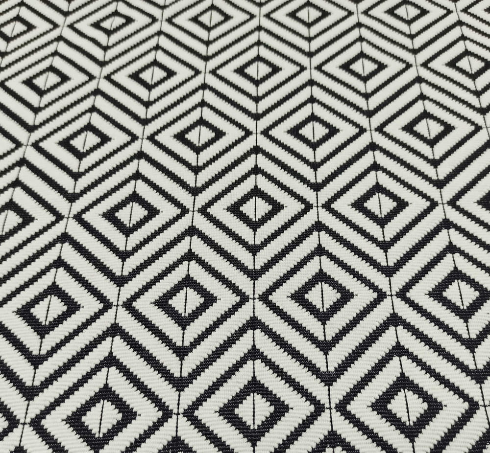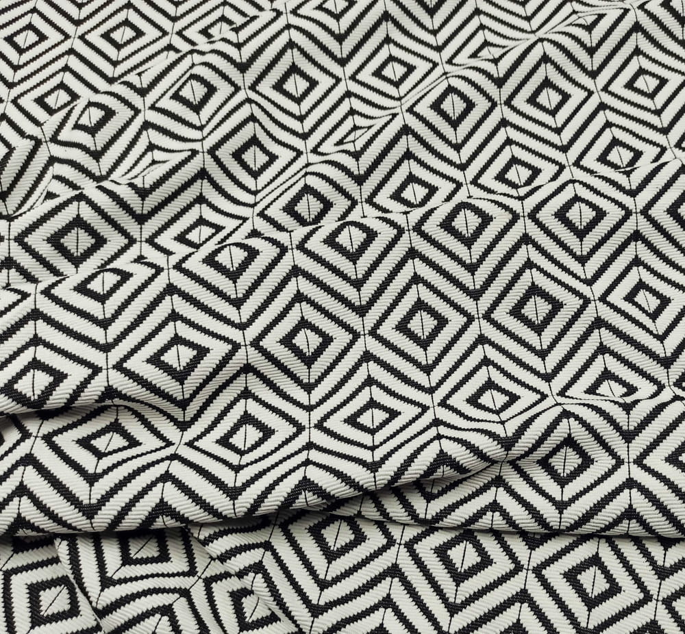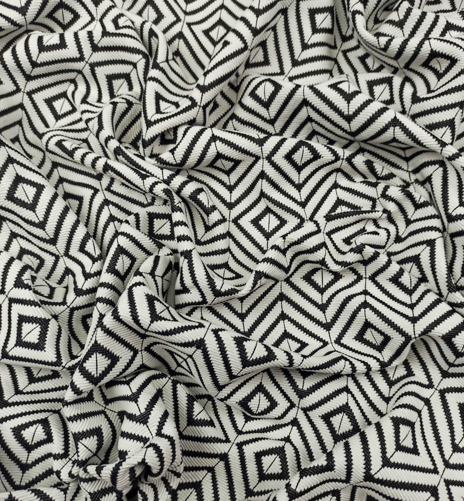 Dzianina ta prezentuję wzór geometryczny biało czarne kwadraty, romby. W aktualnych trendach znajdzie swoje wszechstronne zastosowanie, zarówno w odzieży eleganckiej, jak i casualowej.