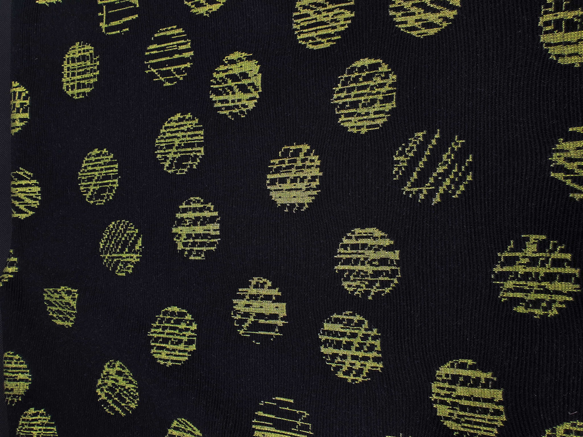 Dzianina ta prezentuję wzór zielonych kółek na czarnym tle. W aktualnych trendach znajdzie swoje wszechstronne zastosowanie, zarówno w odzieży eleganckiej, jak i casualowej.