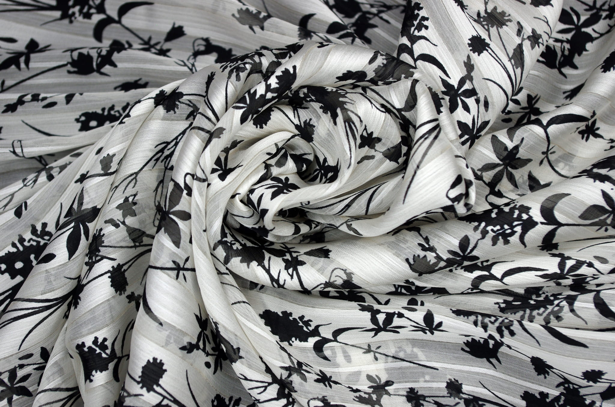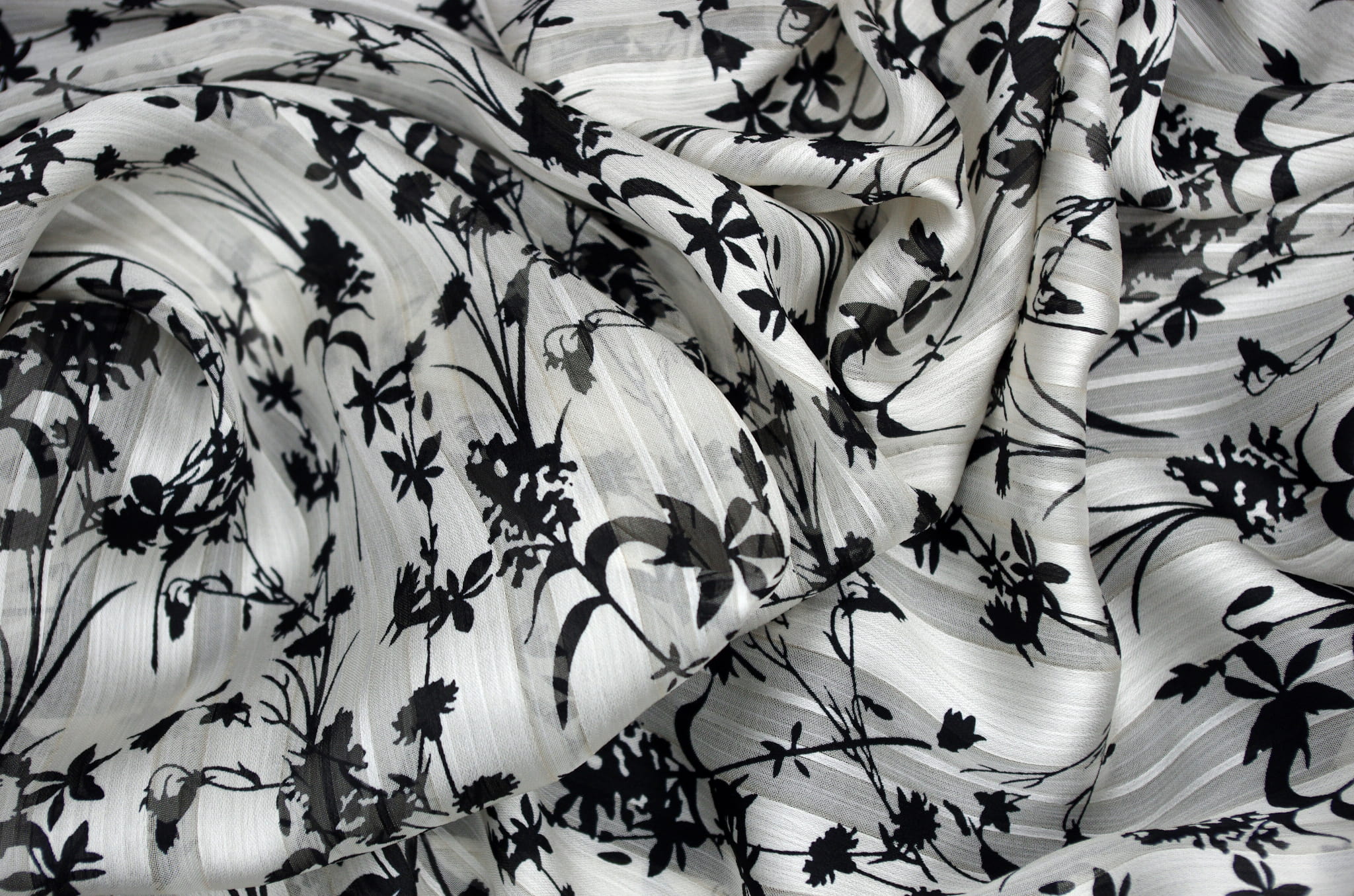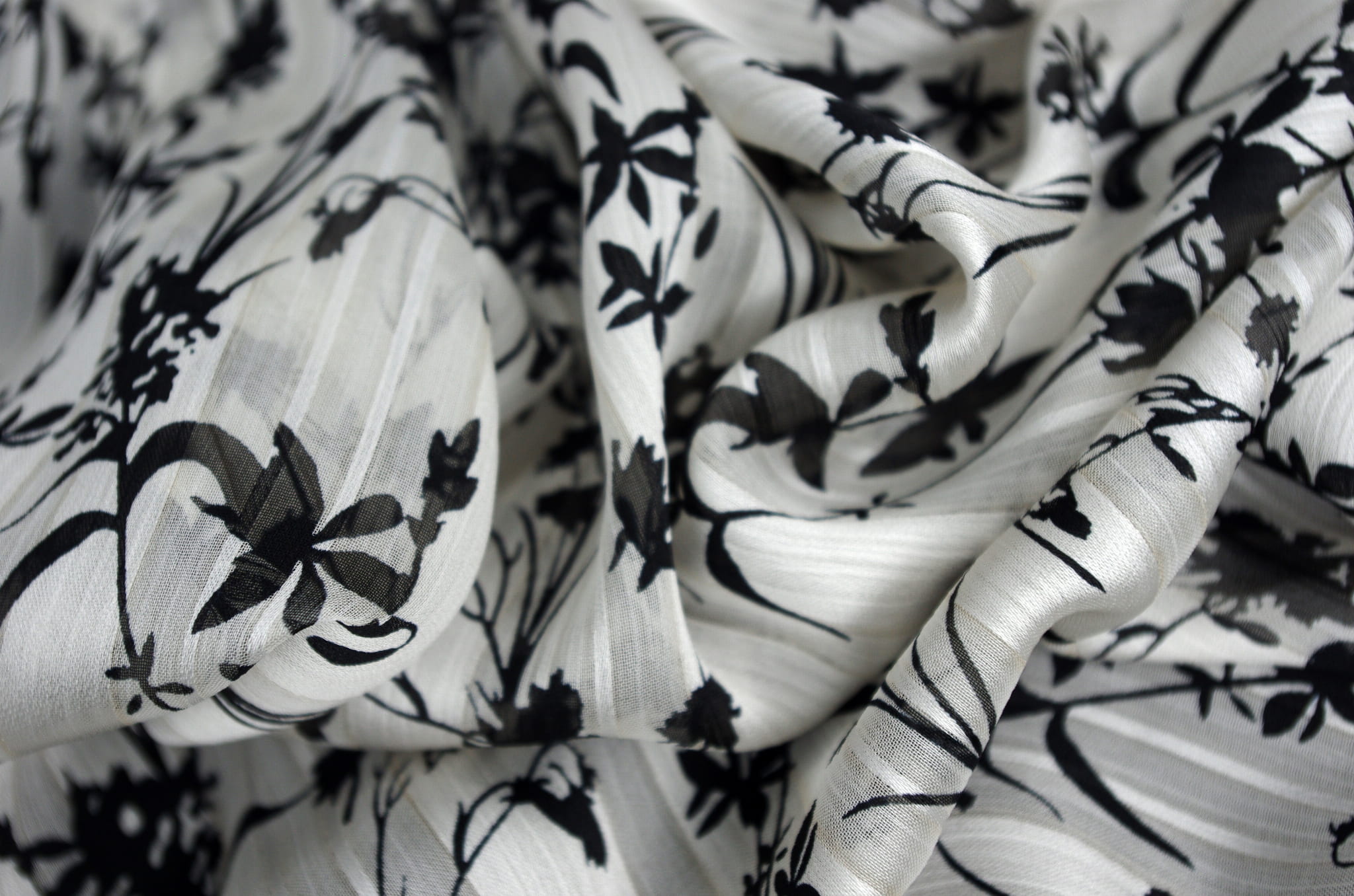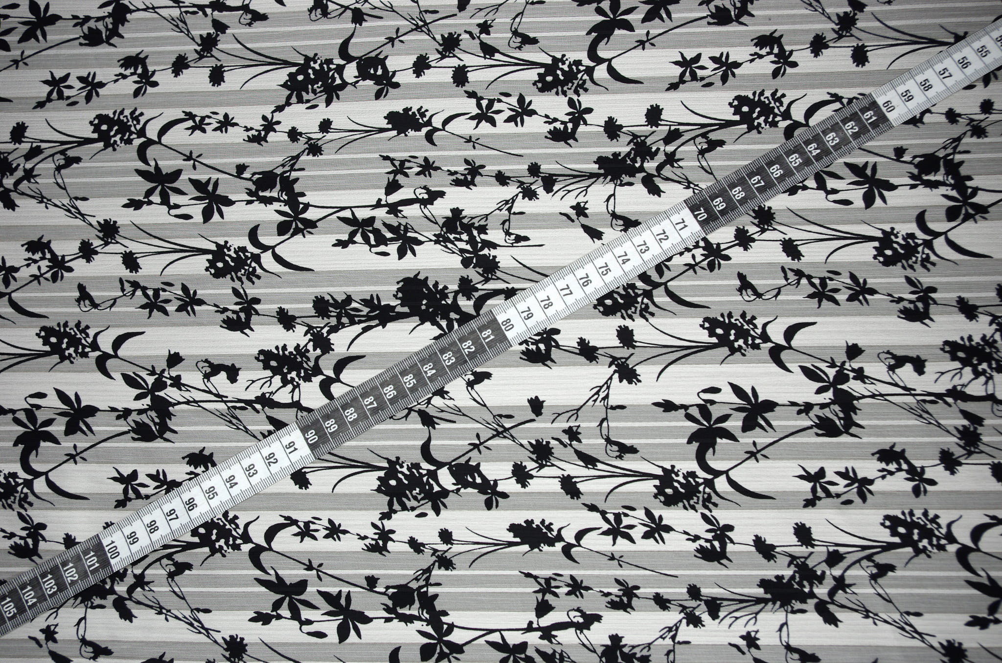 Szyfon Żakardowy z Paskiem Satynowym Tkanina Drukowana Czarne Kwiaty na Kremowym Tle IO5558/08ECRU