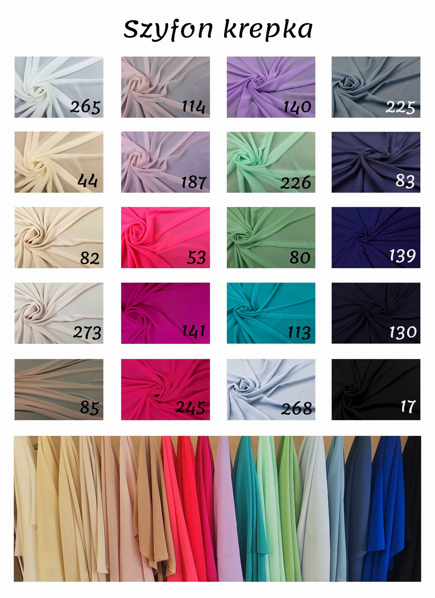 - Faktura i wygląd: W przeciwieństwie do gładkiego szyfonu, krepa szyfonowa ma lekko chropowatą, "ziarnistą" powierzchnię, co nadaje jej unikalny wygląd. Może występować w wersji matowej lub z delikatnym połyskiem.