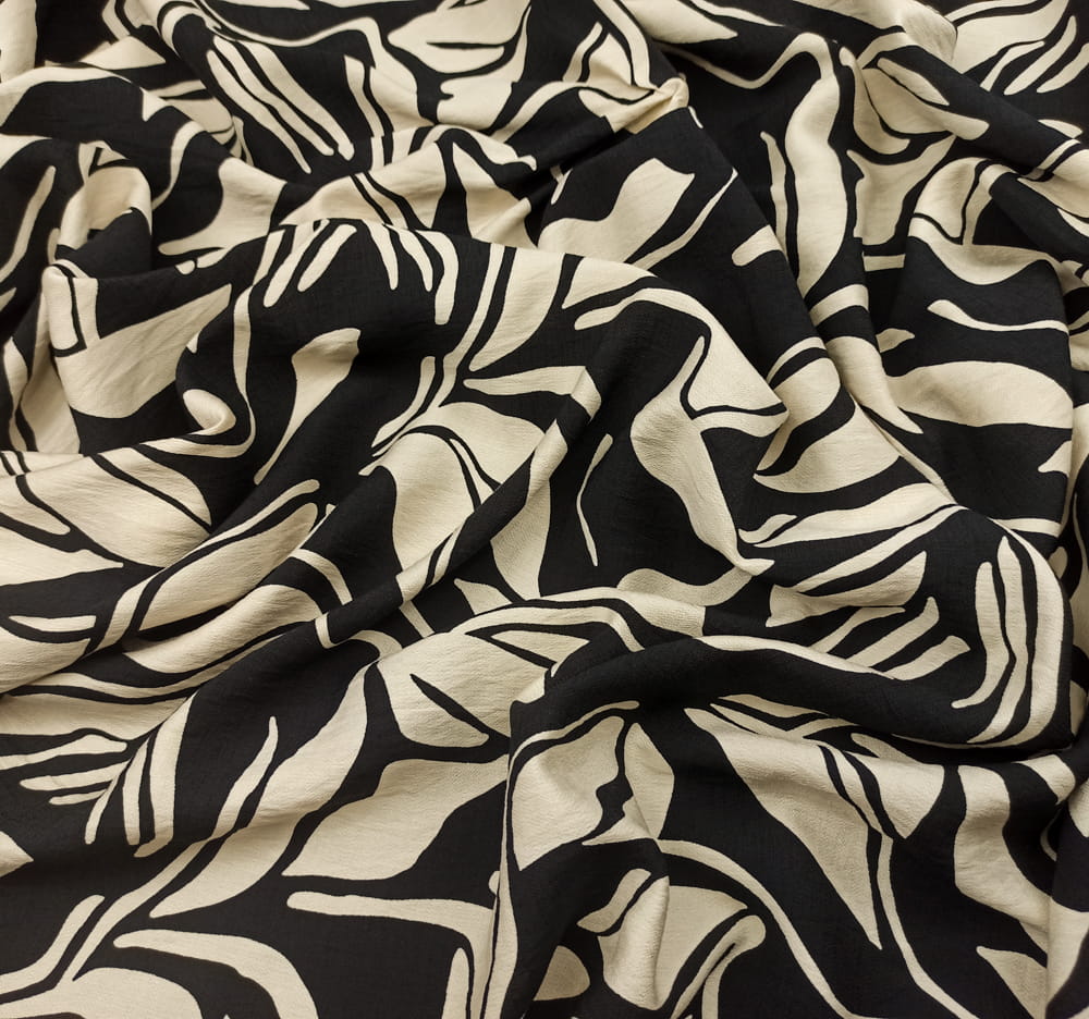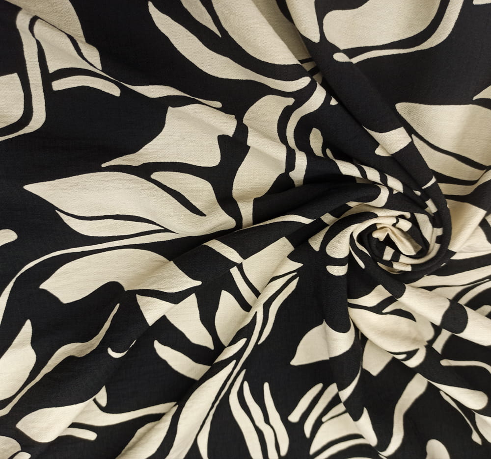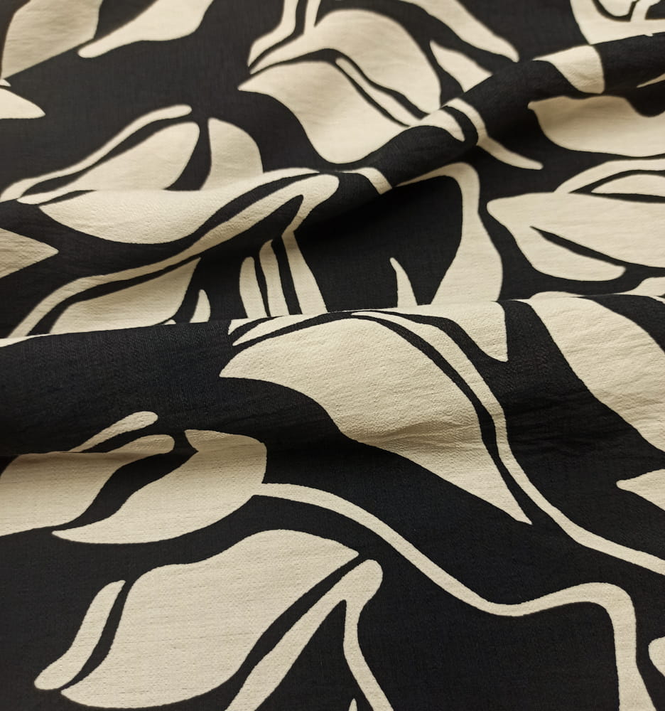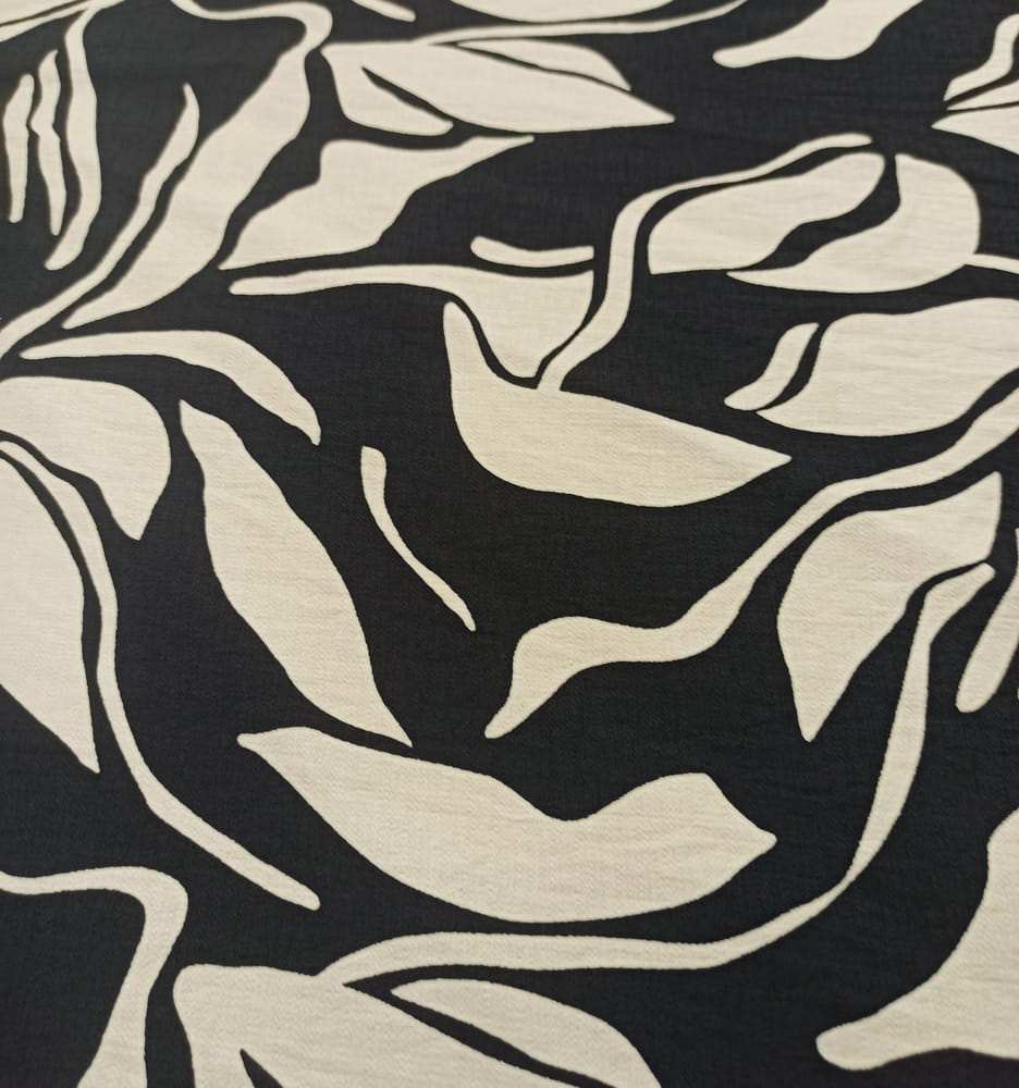 TKANINA WISKOZA KRESZ WZÓR KREMOWE ECRU LIŚCIE NA CZARNYM TLE ID5012208/001