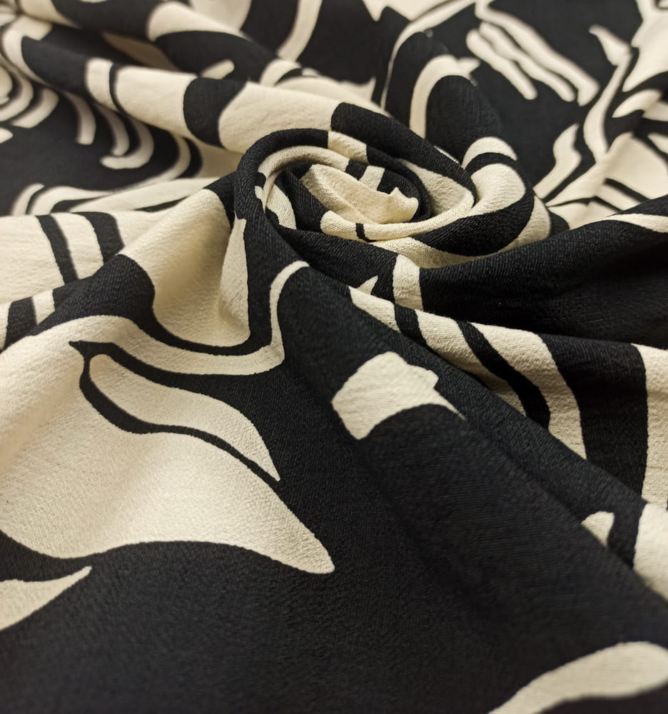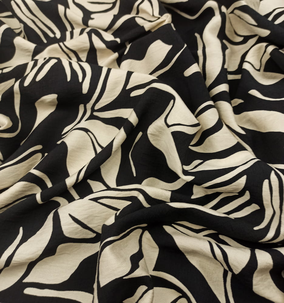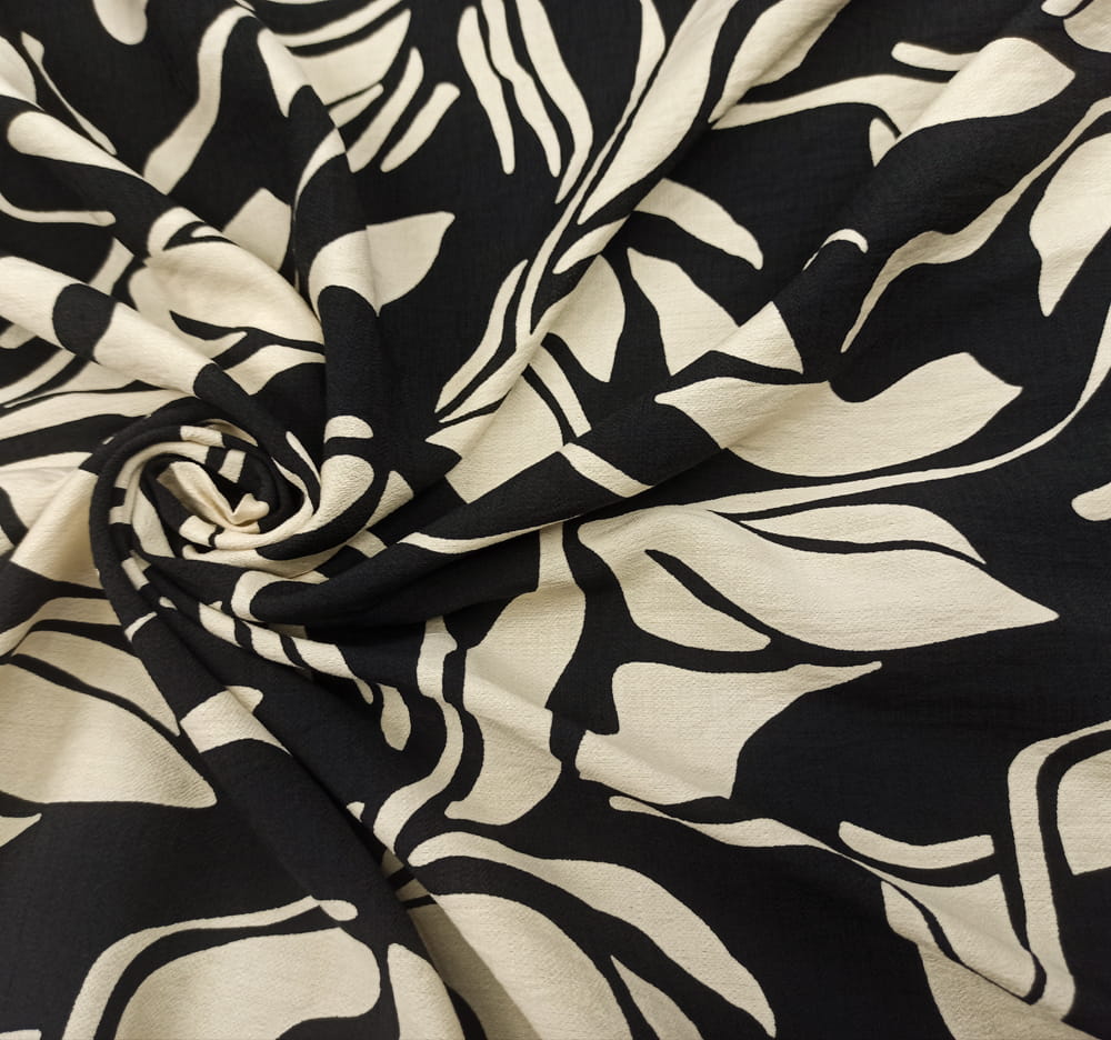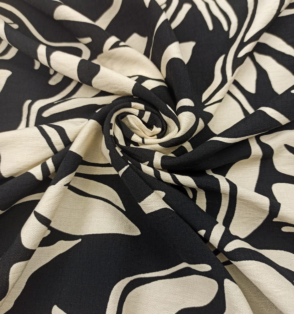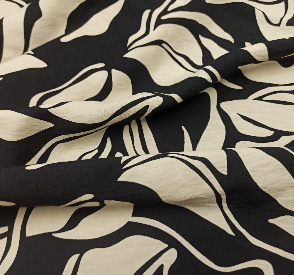 TKANINA WISKOZA KRESZ WZÓR KREMOWE ECRU LIŚCIE NA CZARNYM TLE ID5012208/001