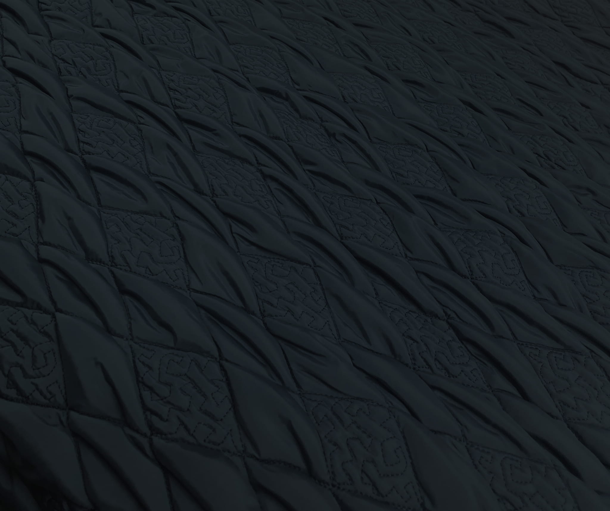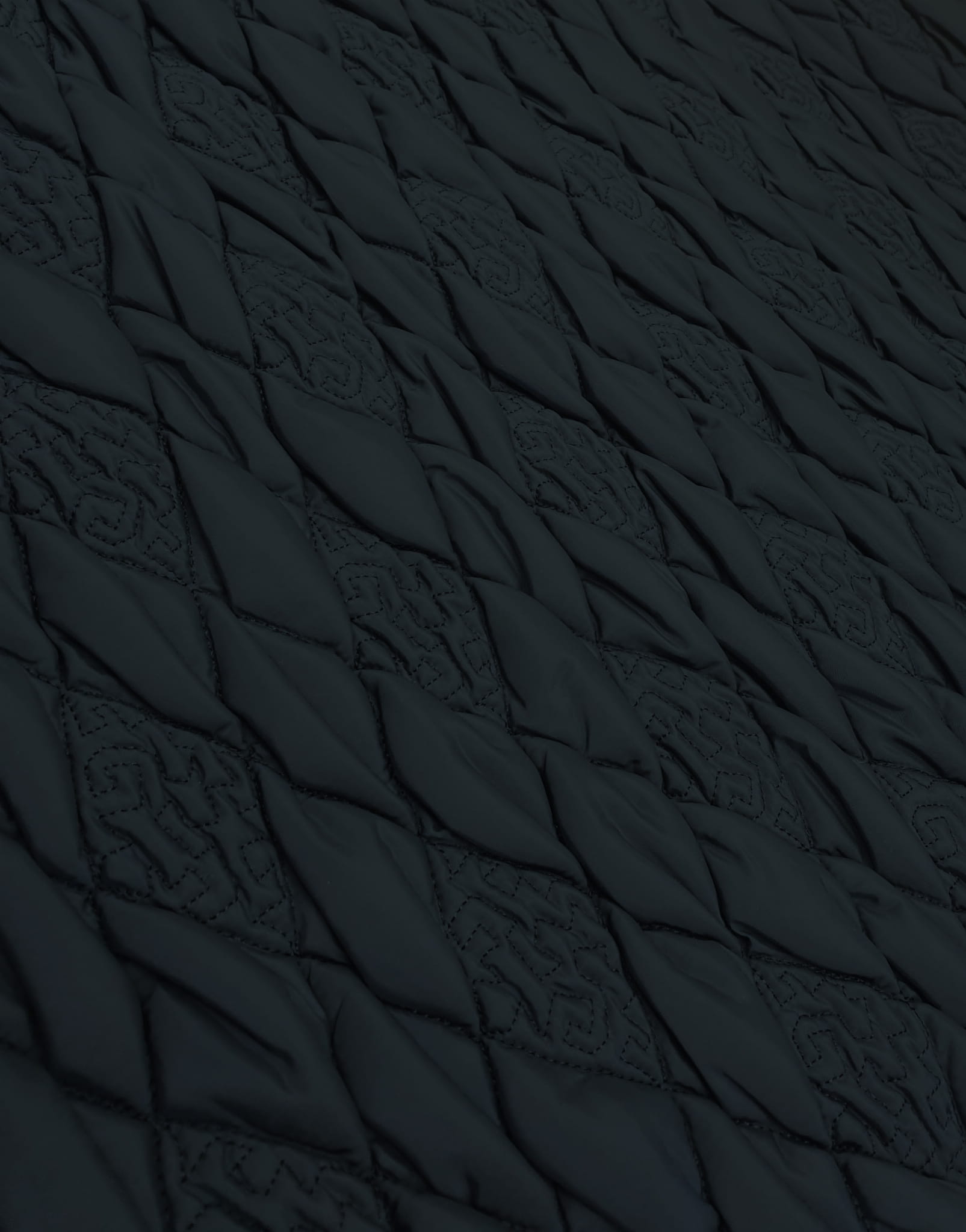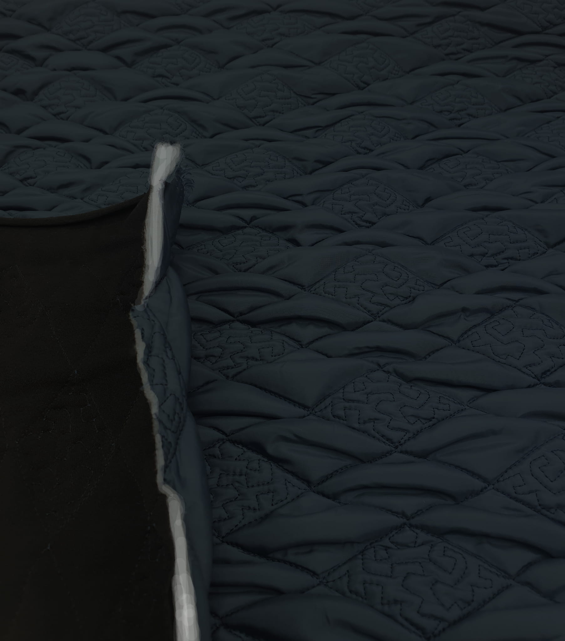 Prezentowana tkanina jest lekko błyszcząca, ciepła w najmodniejszym pikowanym wzorze- romby w odcieniu granatowym. Wewnętrzna strona obszyta czarna podszewką.