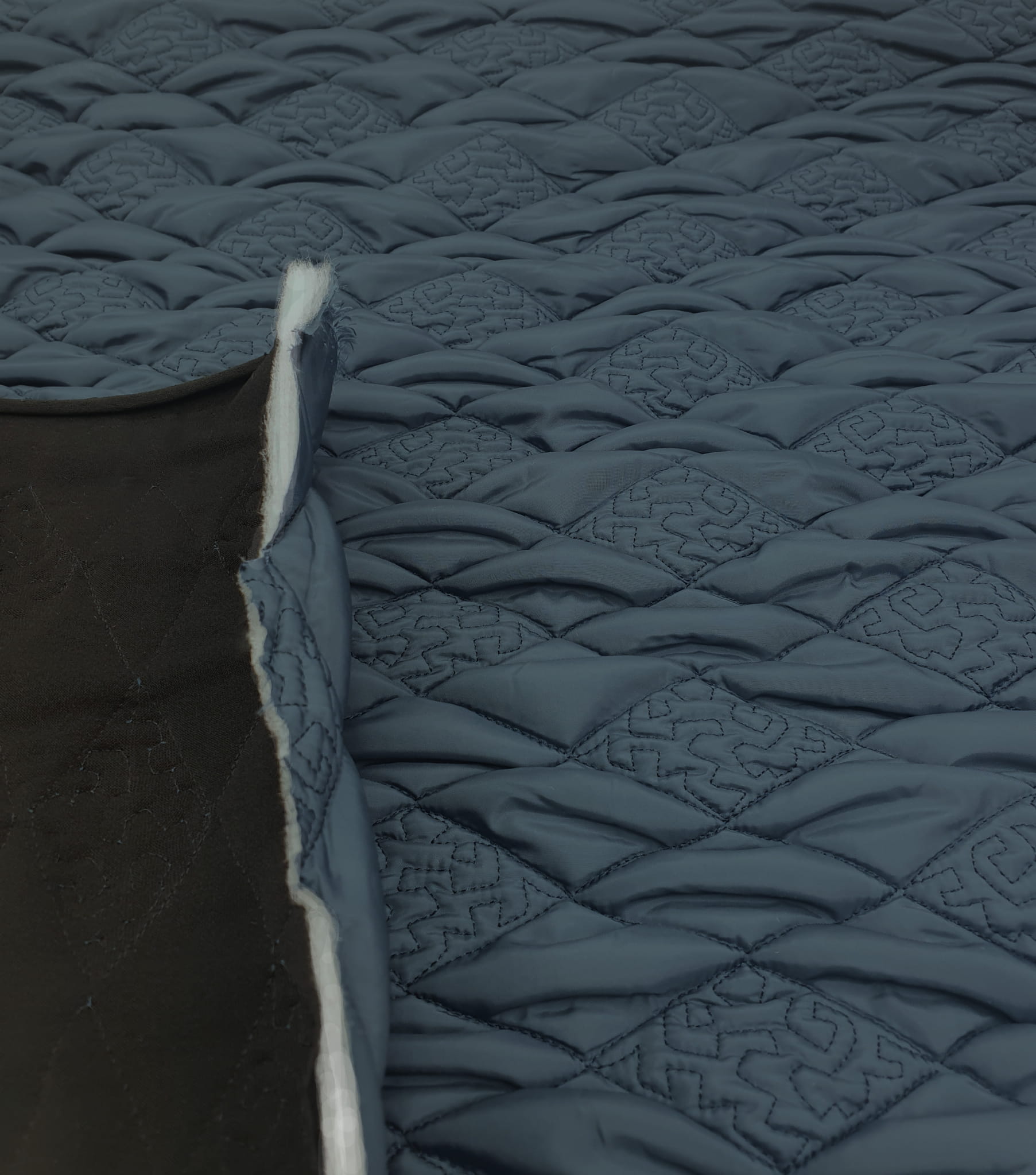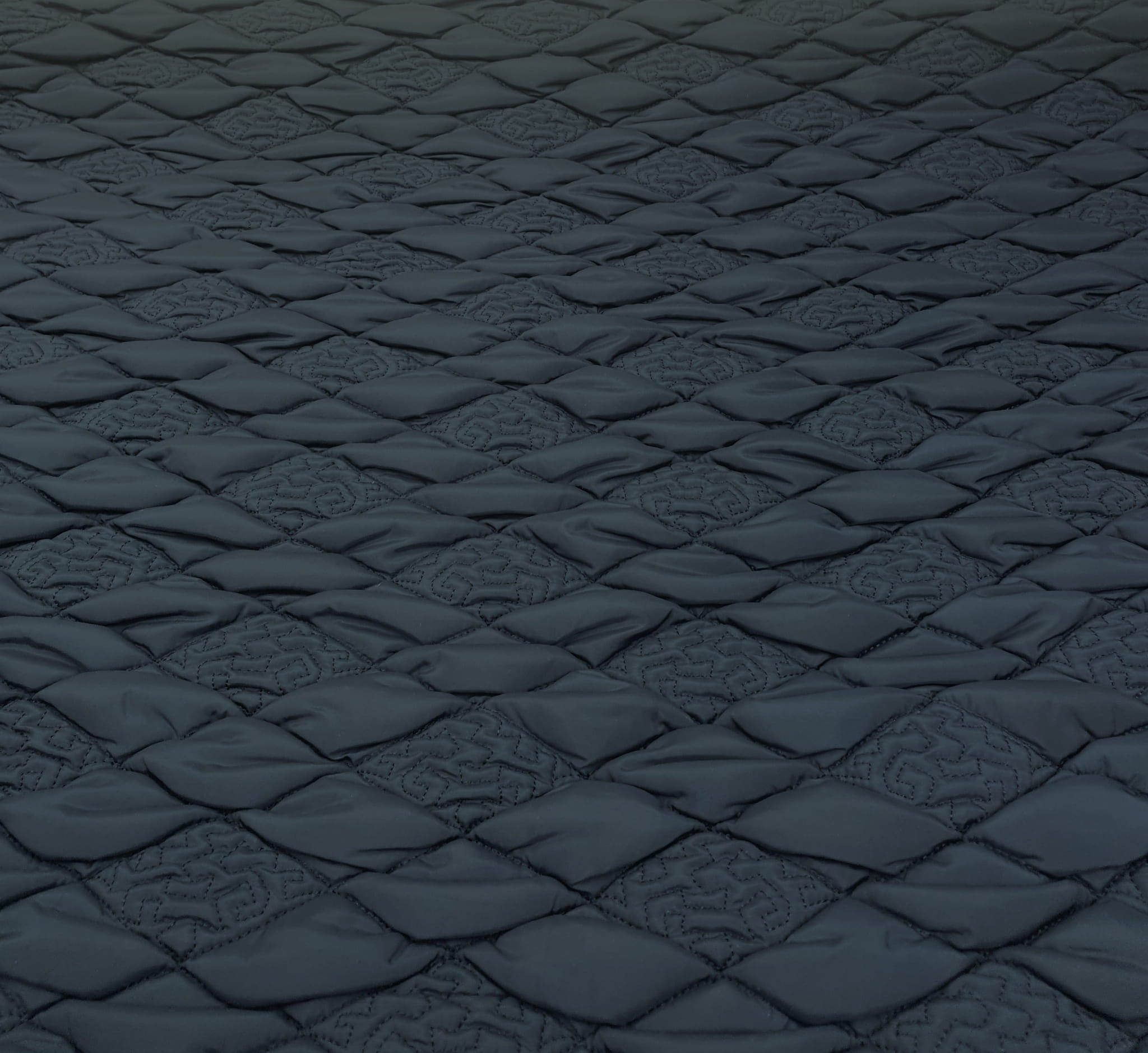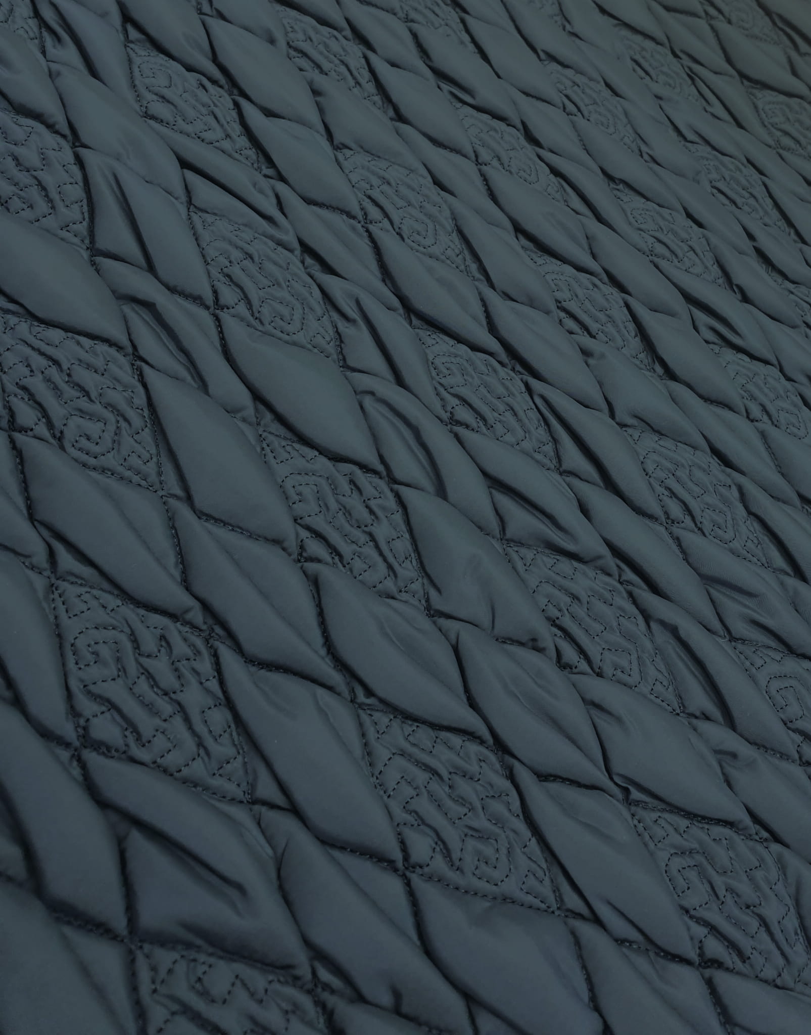 Prezentowana tkanina jest lekko błyszcząca, ciepła w najmodniejszym pikowanym wzorze- romby w odcieniu granatowym. Wewnętrzna strona obszyta czarna podszewką.