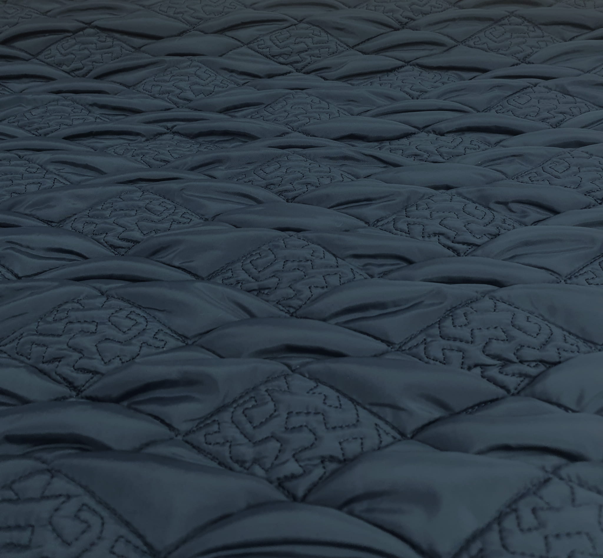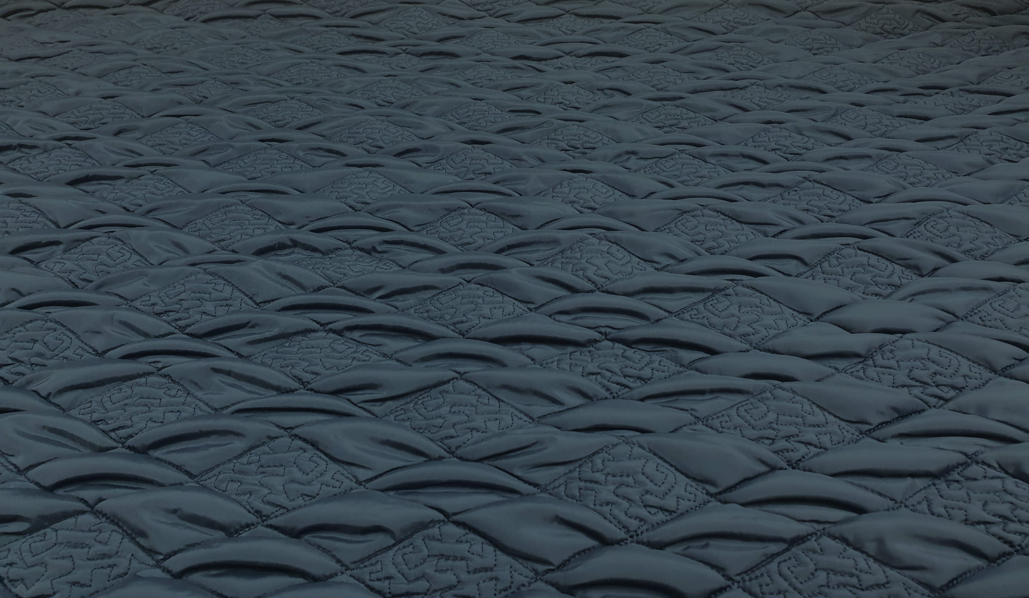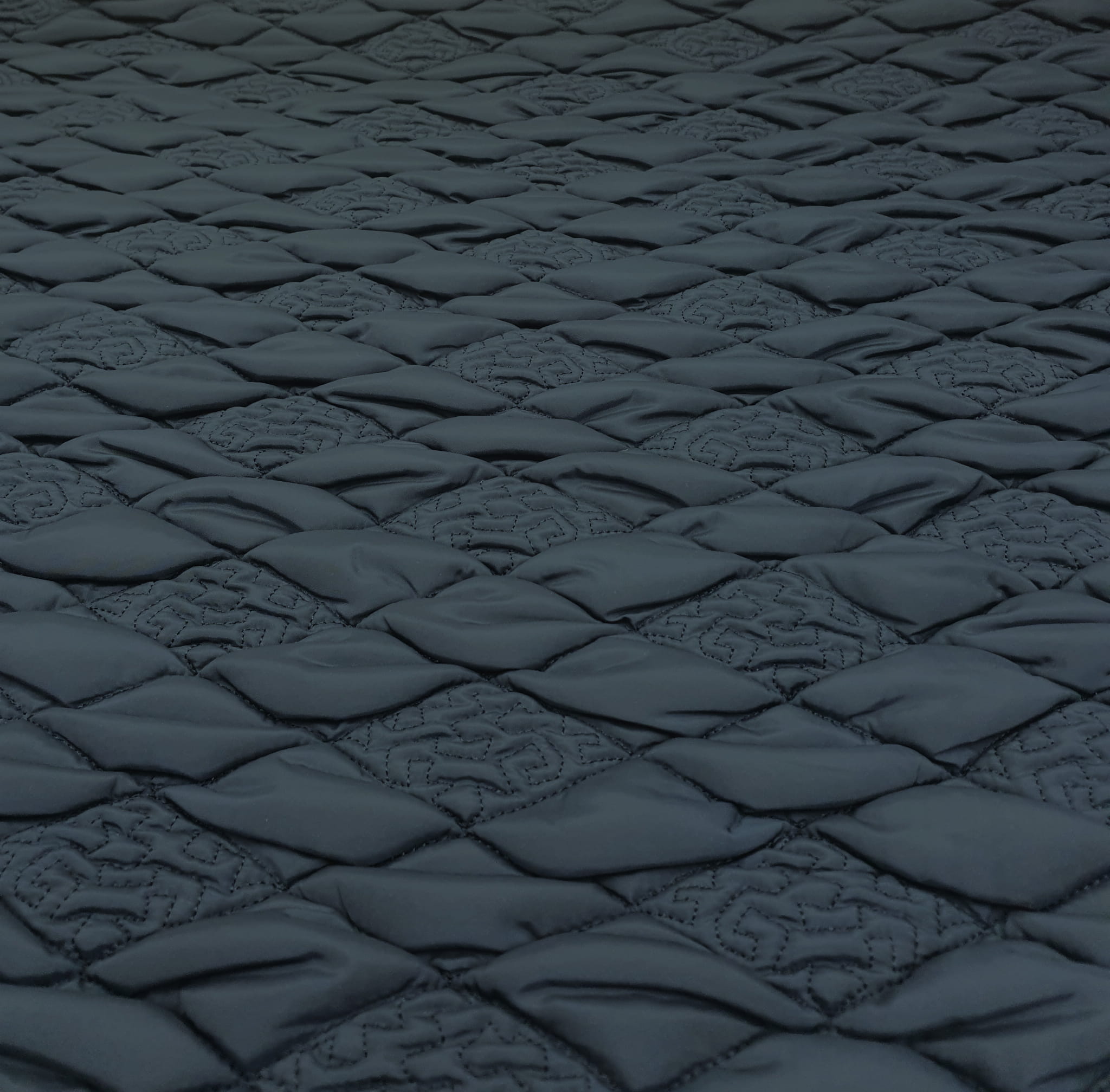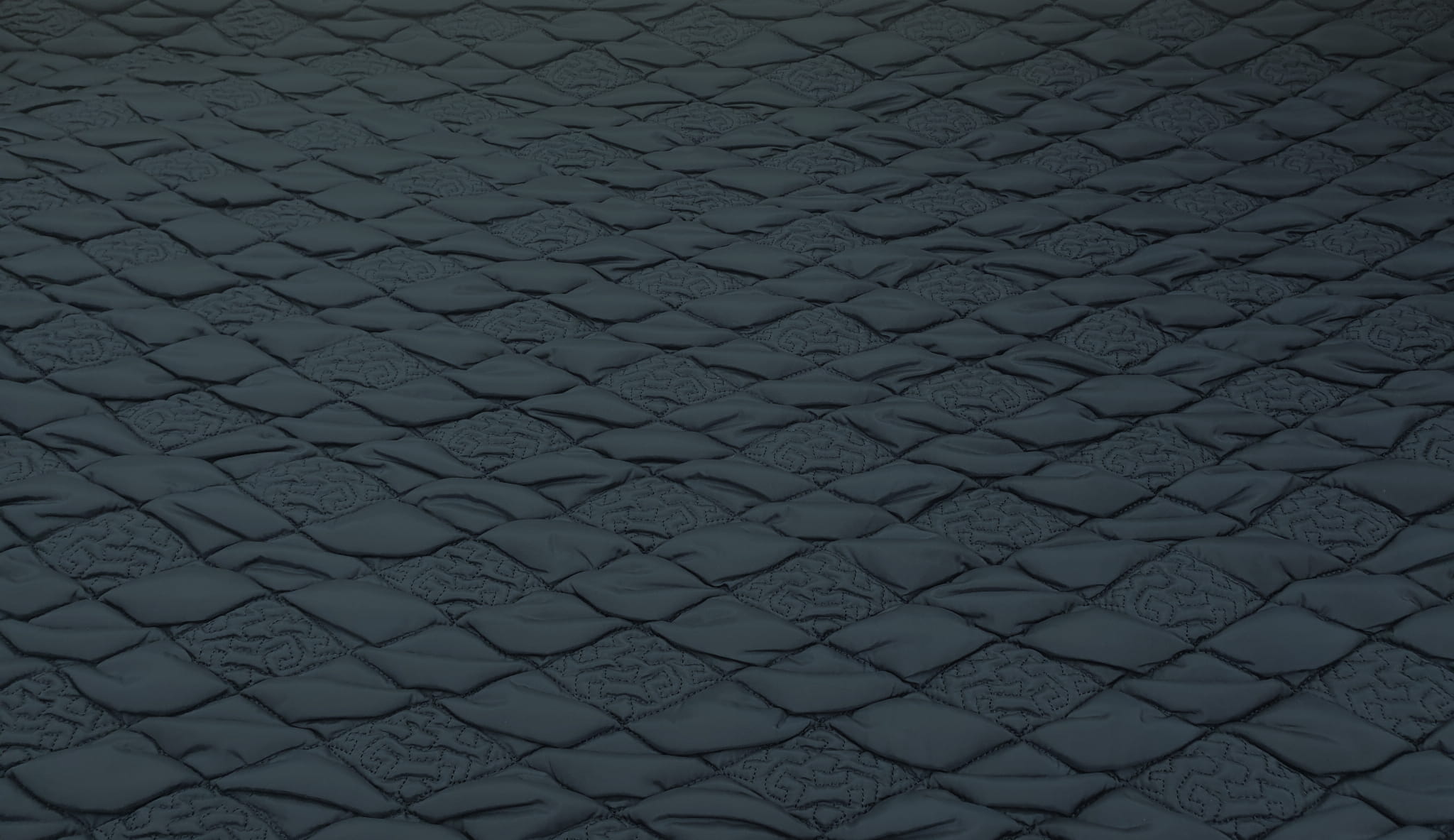 Prezentowana tkanina jest lekko błyszcząca, ciepła w najmodniejszym pikowanym wzorze- romby w odcieniu granatowym. Wewnętrzna strona obszyta czarna podszewką.