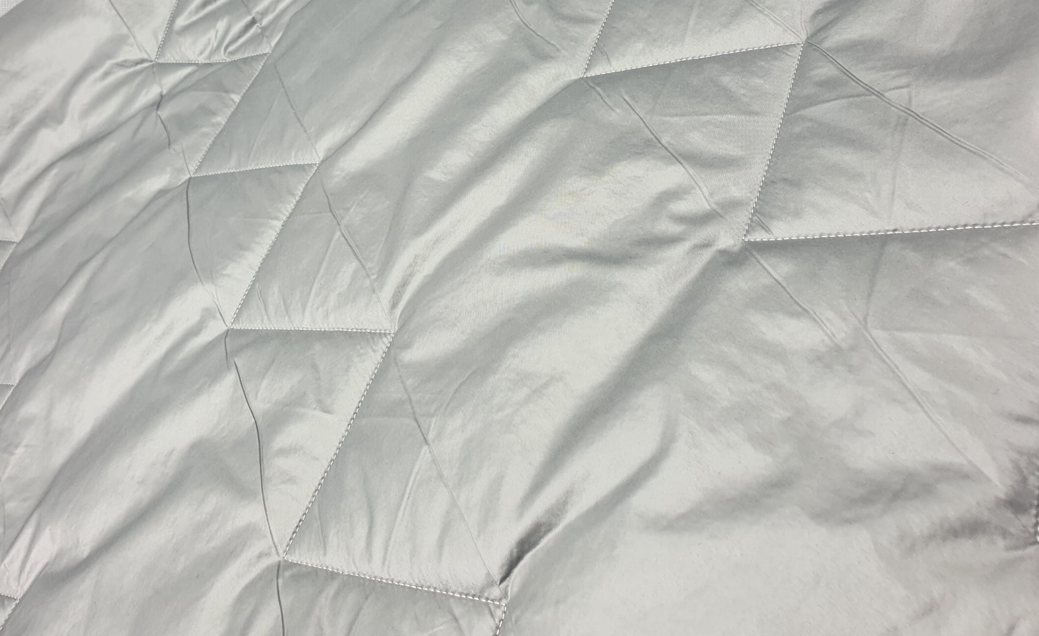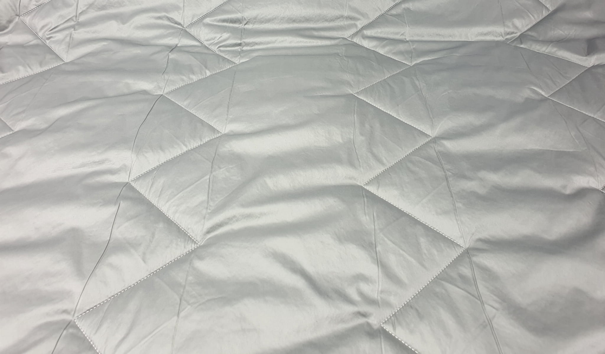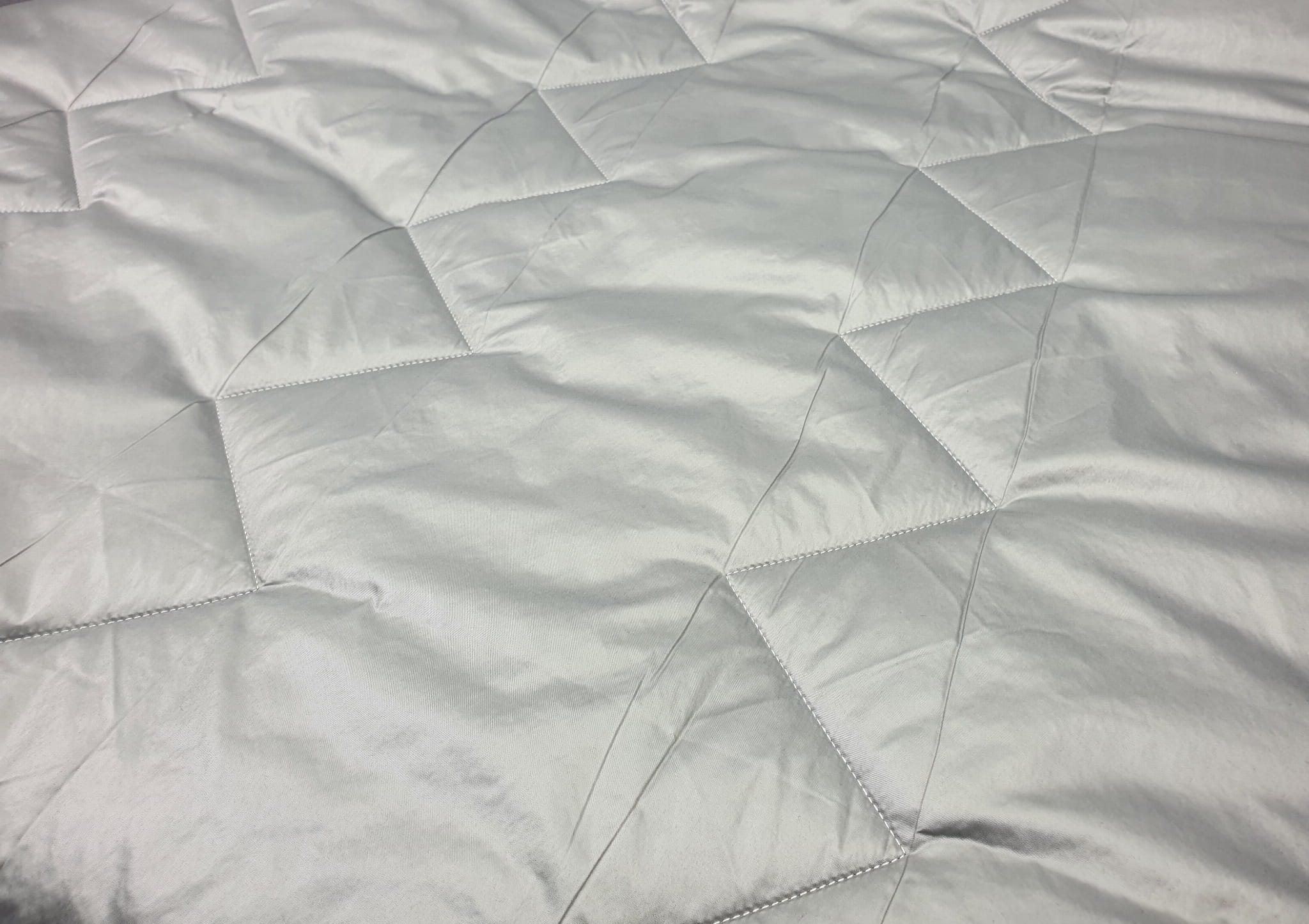 Prezentowana tkanina jest lekko błyszcząca, ciepła w najmodniejszym pikowanym wzorze- trójkąty w odcieniu szarości.