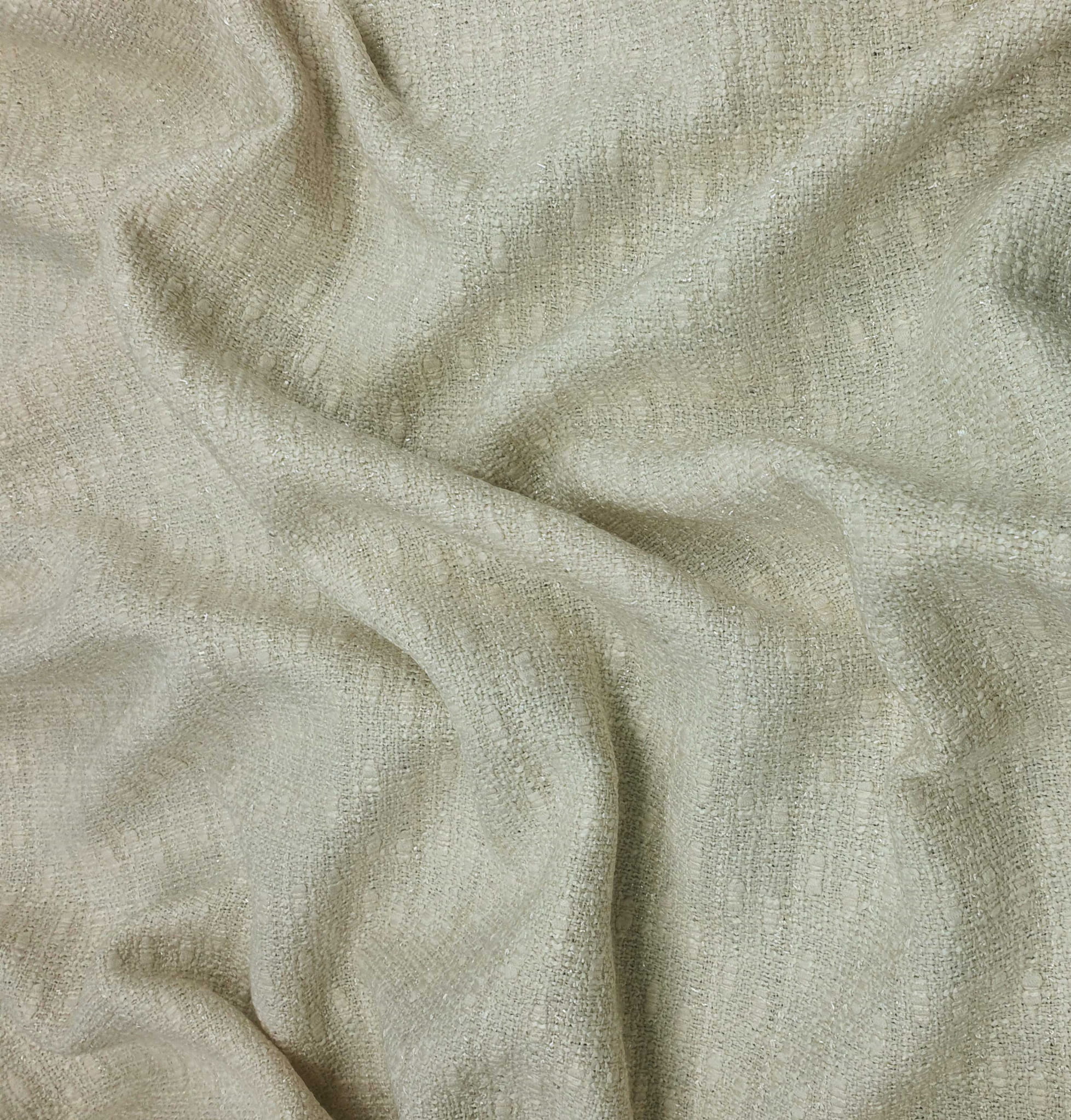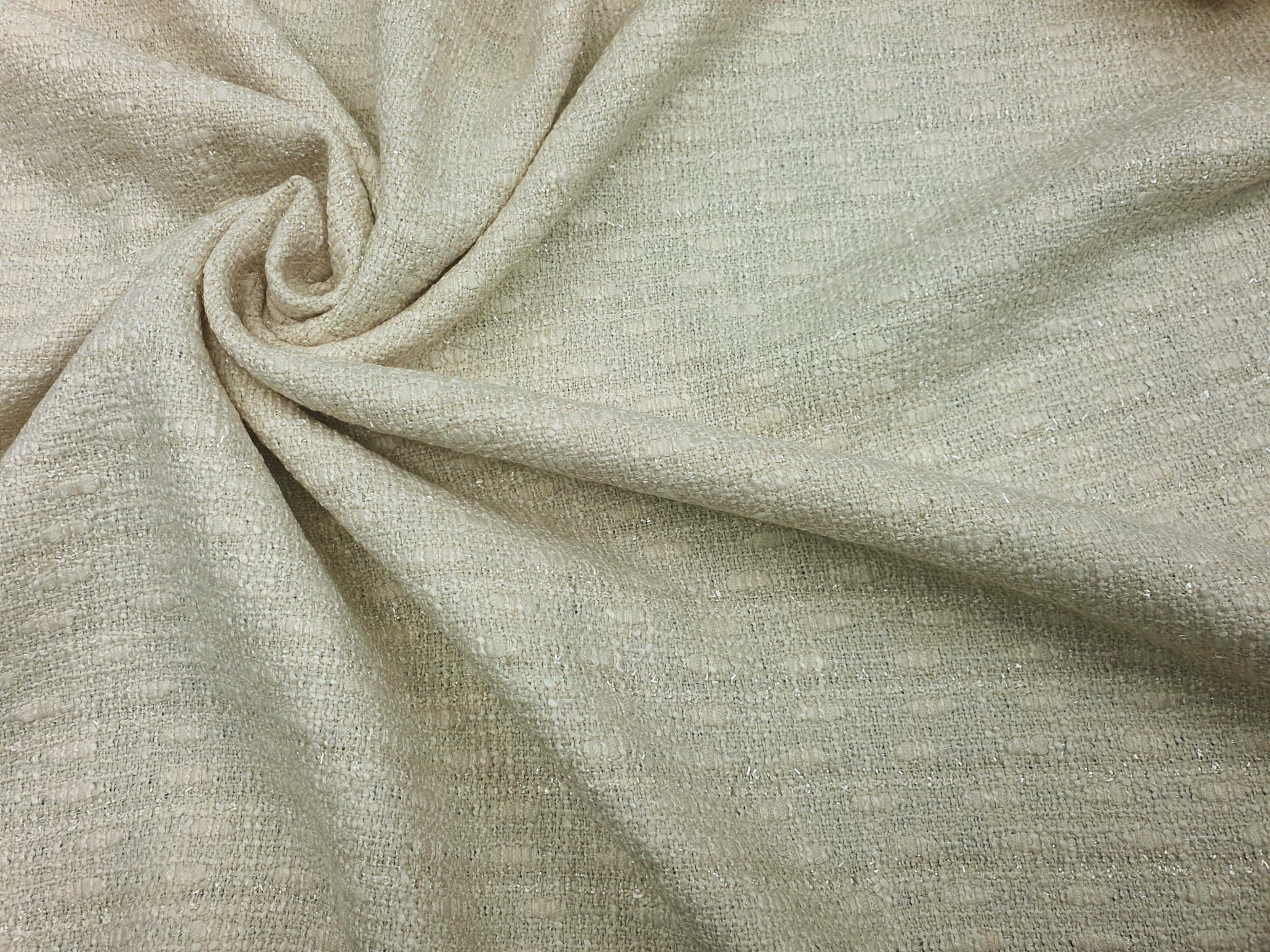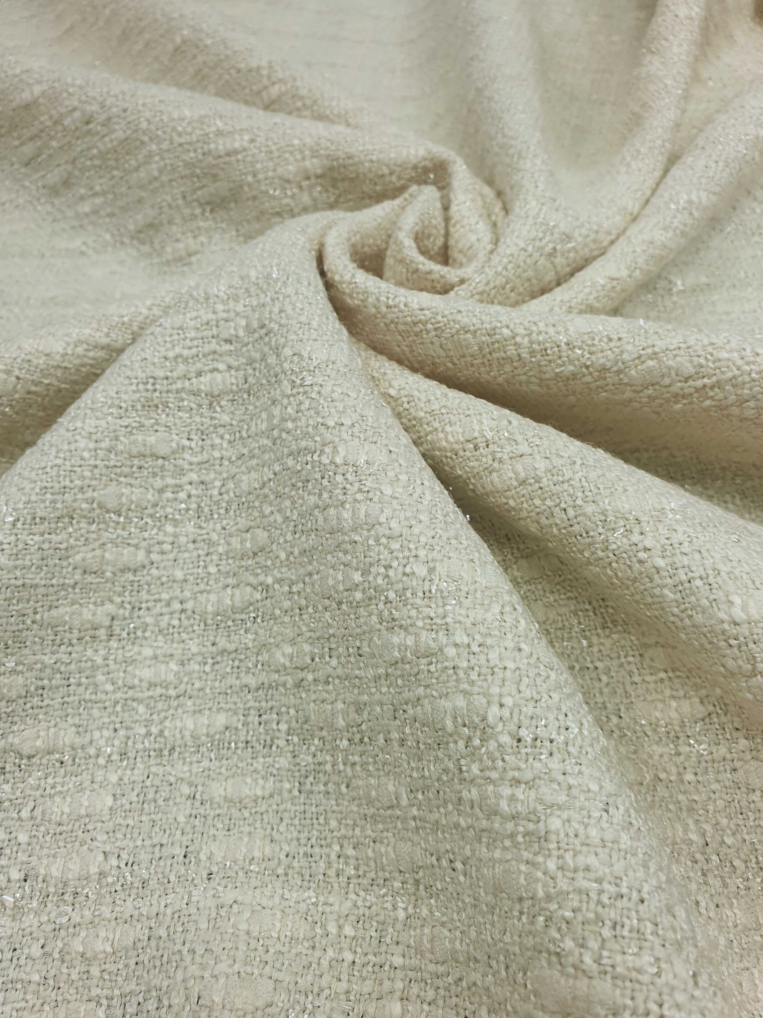 Elegancka, średniej grubości tkanina z gęstym splotem chanelowym w odcieniu jasnego beżu. Na prezentowanej tkaninie przechodzą po szerokości wypełnione srebrne nitki lureksowe.