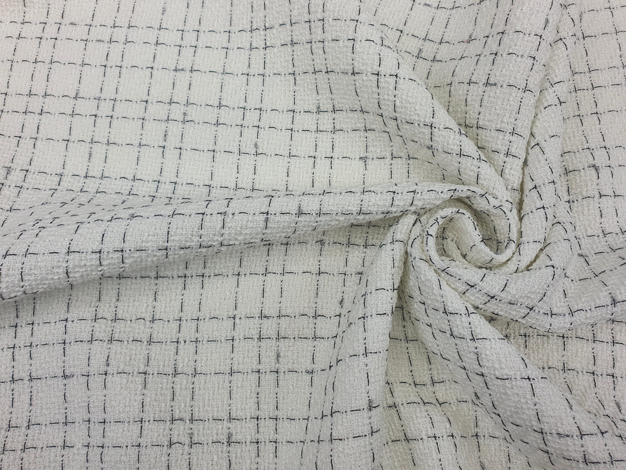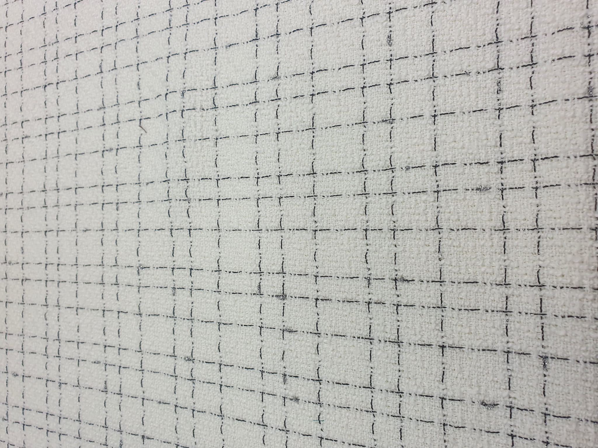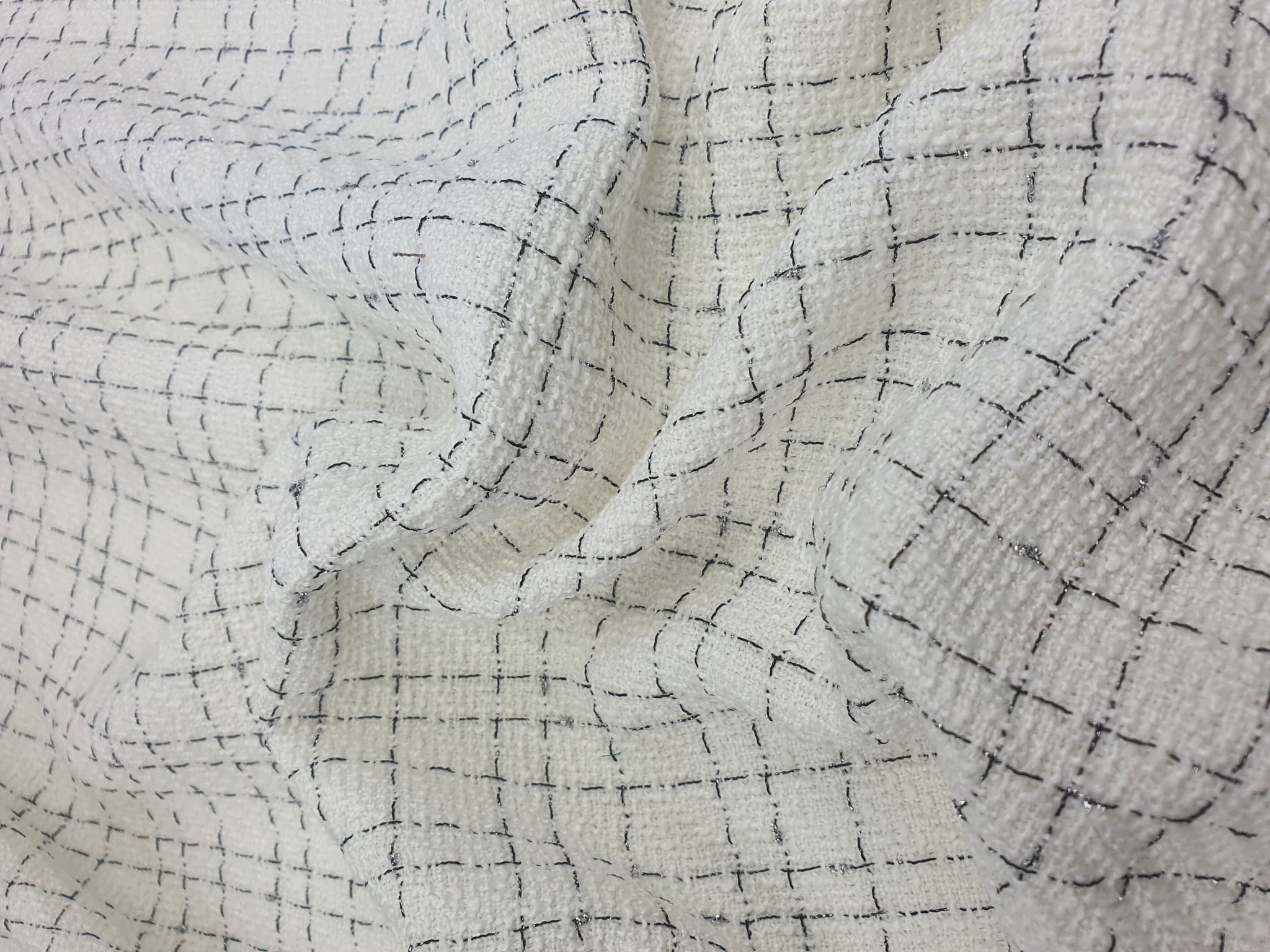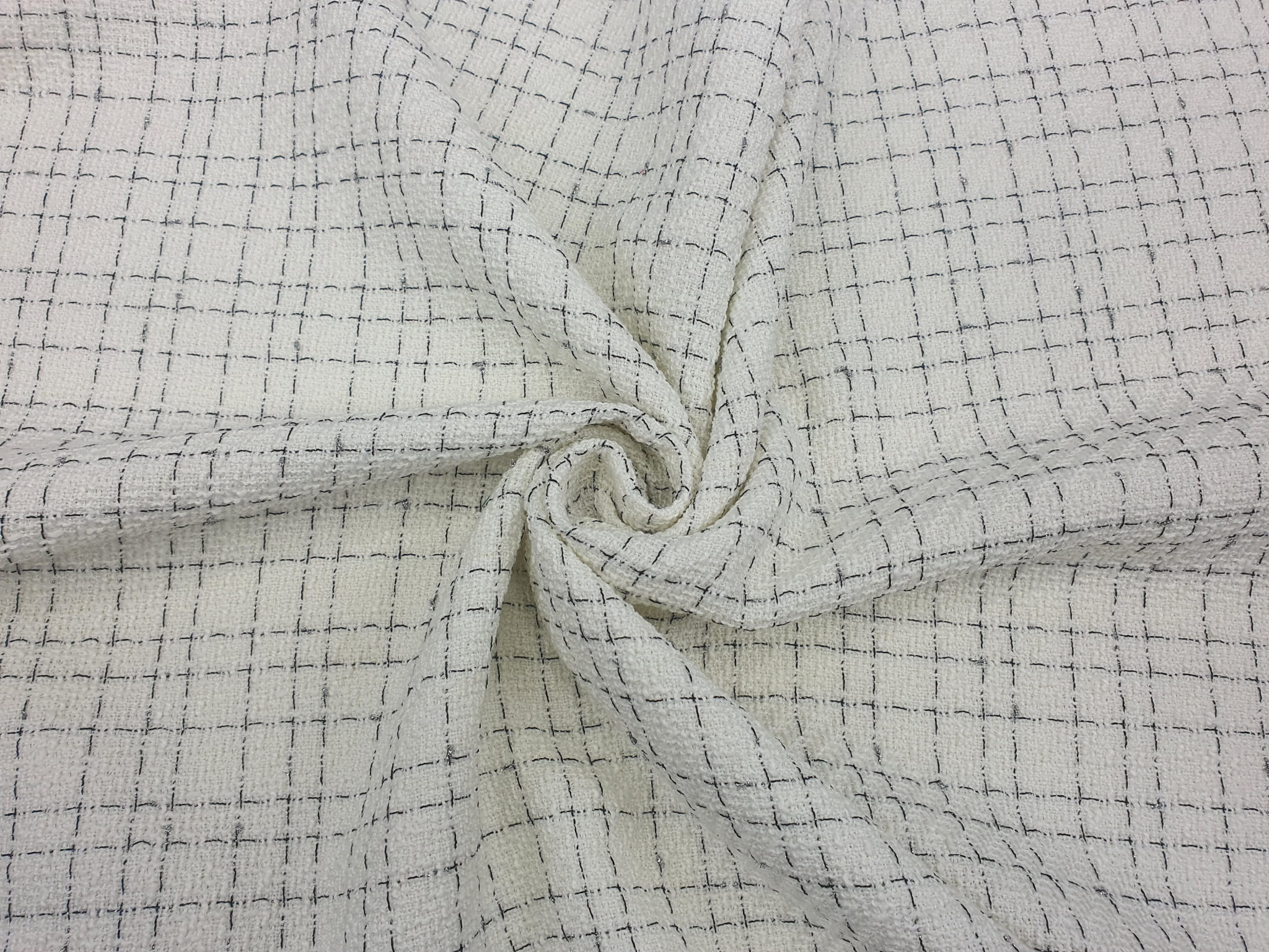 Elegancka, średniej grubości tkanina z gęstym splotem chanelowym w odcieniu ecru. Na prezentowanej tkaninie przechodzą naprzemiennie wypełnione czarne i srebrne nitki lureksowe.