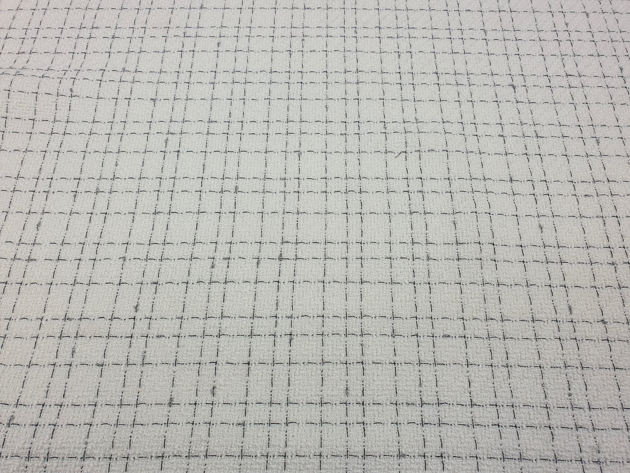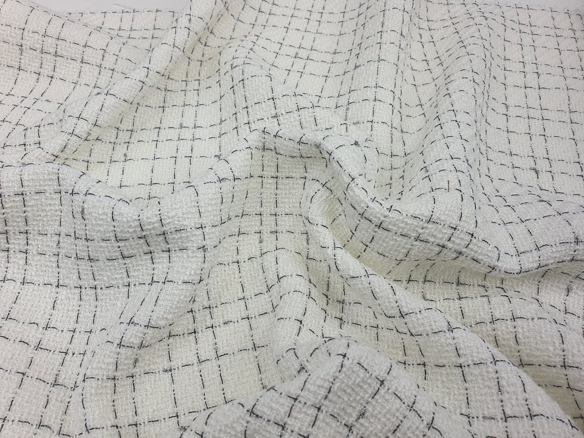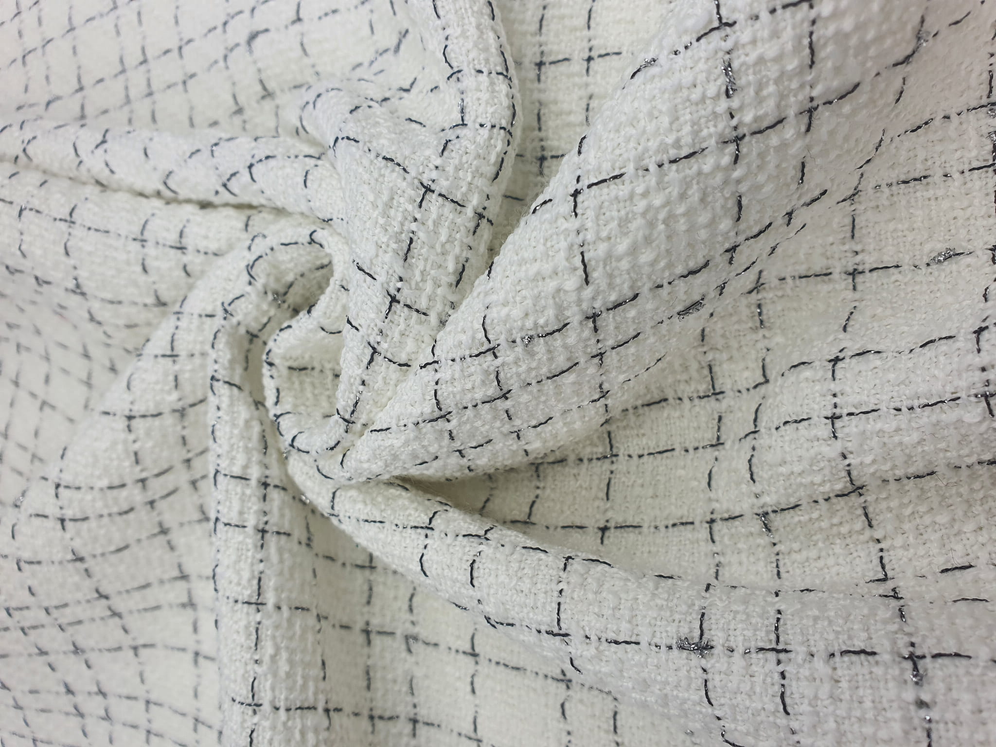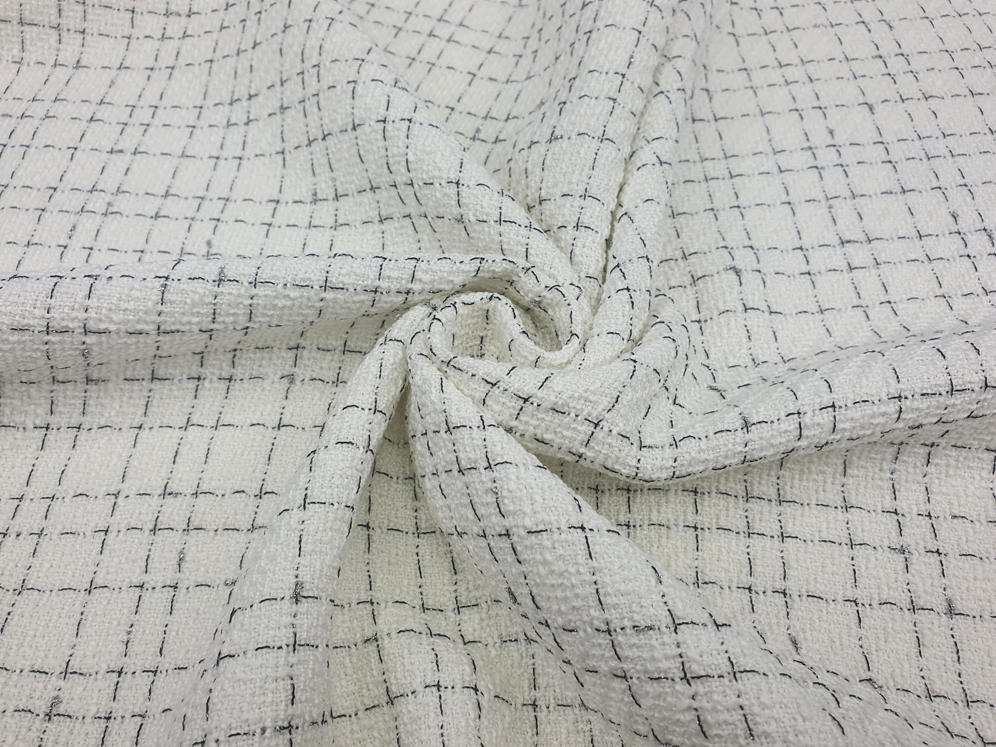 Elegancka, średniej grubości tkanina z gęstym splotem chanelowym w odcieniu ecru. Na prezentowanej tkaninie przechodzą naprzemiennie wypełnione czarne i srebrne nitki lureksowe.